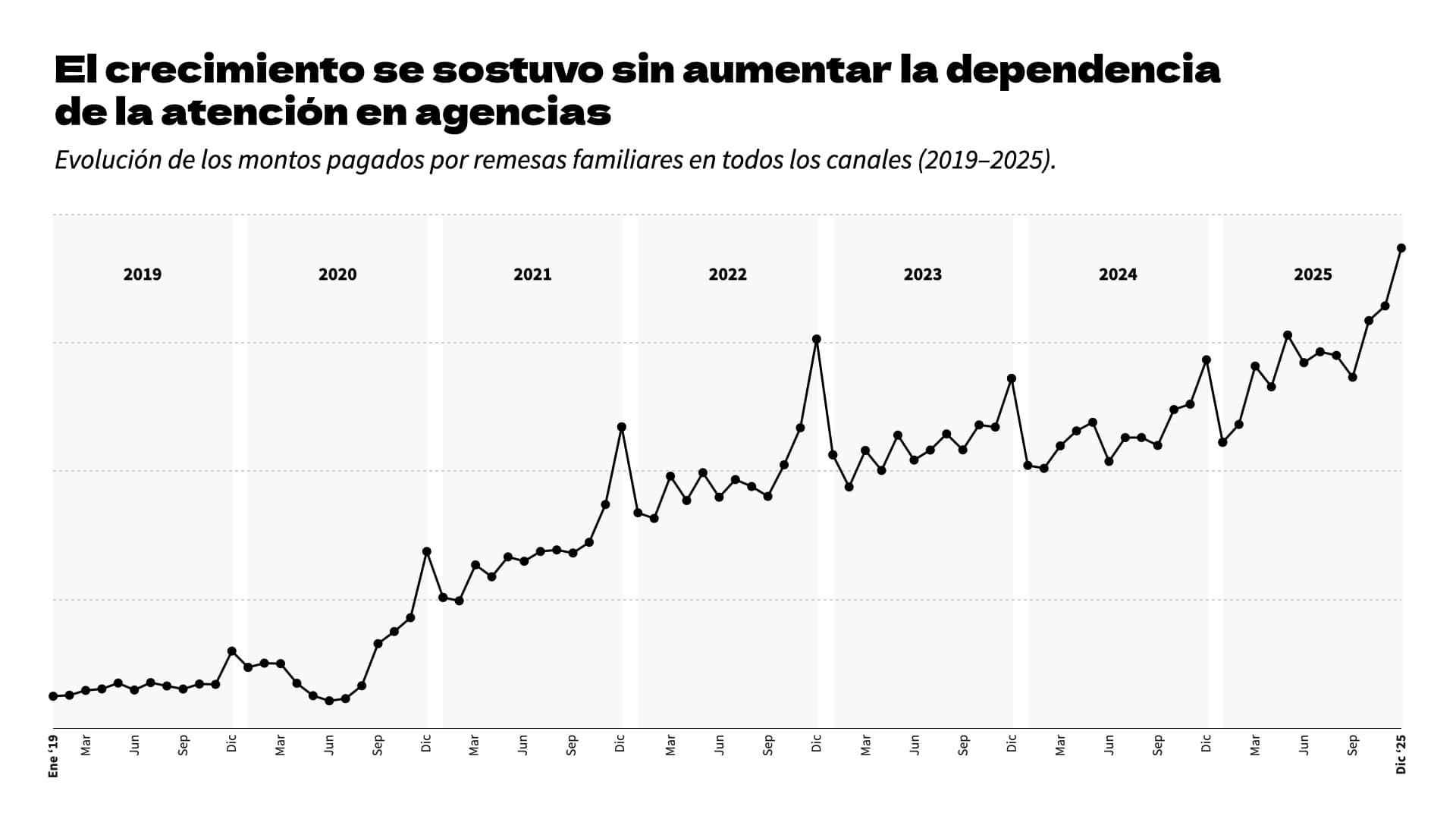 Con el tiempo, el abono a cuenta y la banca móvil pasaron a consolidarse como las principales formas de cobro, reduciendo la dependencia de la ventanilla. Hacia finales de 2025, la adopción digital se sostenía sin incentivos fuertes, con una operación más estable, menores costos y un modelo de crecimiento replicable en el tiempo.